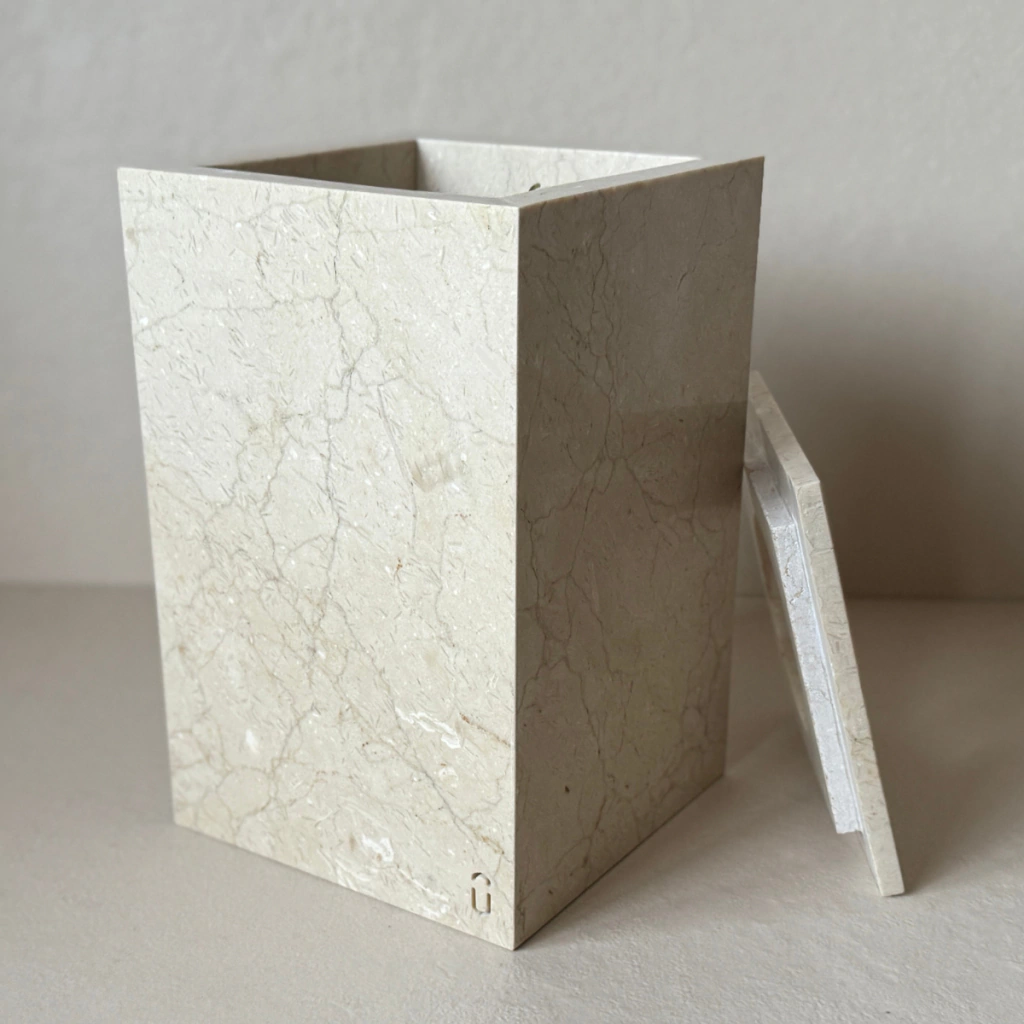O acabamento polido realça os veios únicos do mármore Crema Marfil, uma pedra nobre e de tonalidade bege suave que se harmoniza perfeitamente com qualquer estilo de decoração, do clássico ao contemporâneo. Além de prática, esta lixeira é uma verdadeira obra de arte que exala requinte e durabilidade.