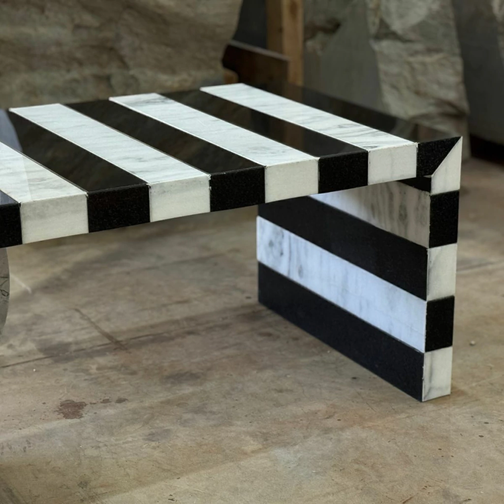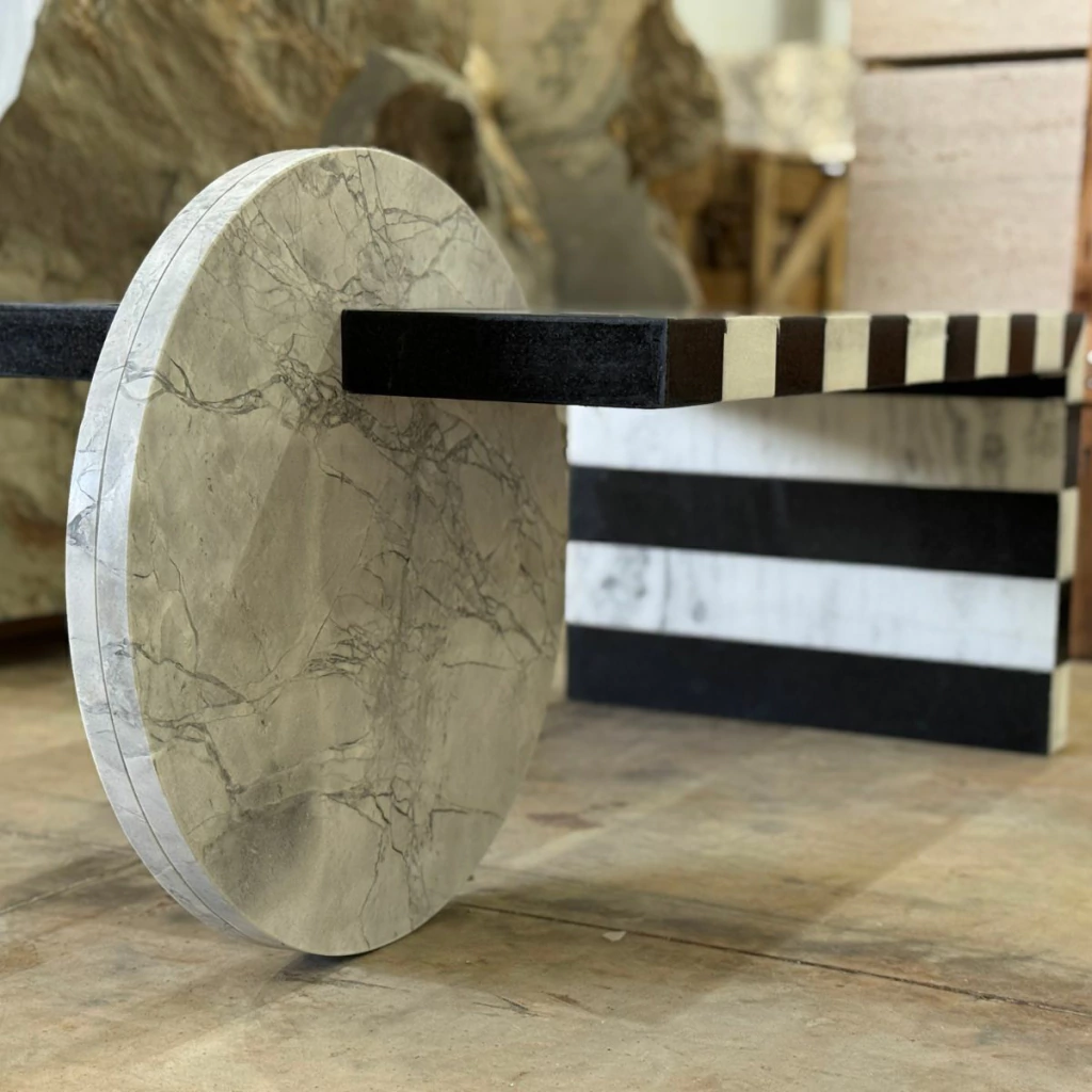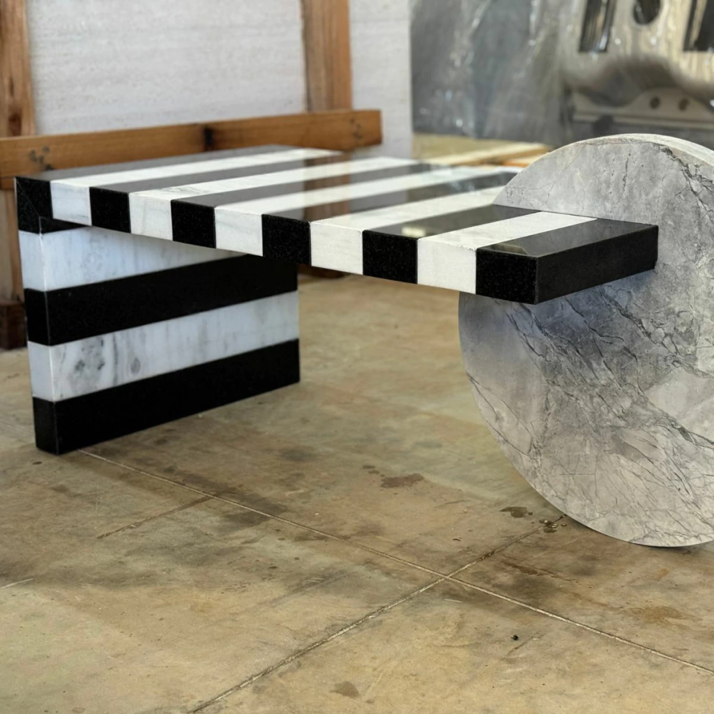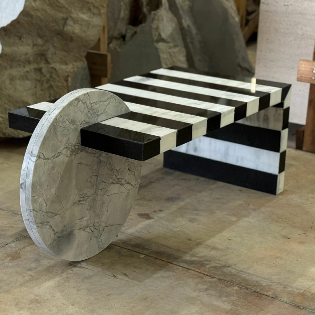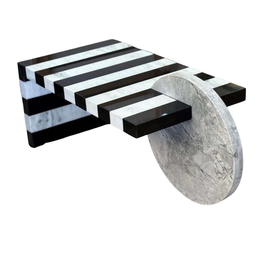 Com uma composição ousada e geométrica, a Mesa de Centro Abstract transforma o granito em arte funcional. Suas listras marcantes em preto e branco criam um efeito visual moderno e elegante, enquanto o apoio circular em pedra maciça traz equilíbrio entre forma e função.