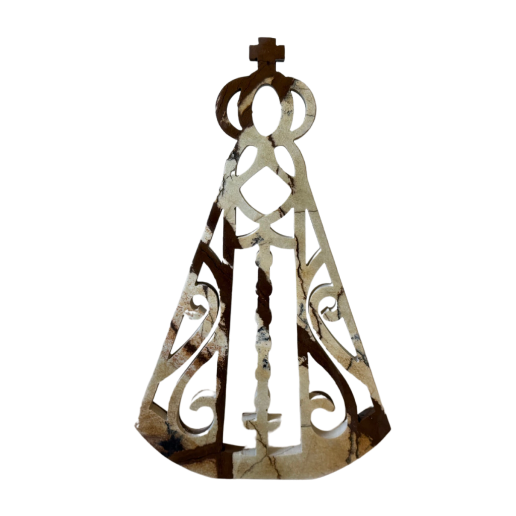 A Escultura de Nossa Senhora Aparecida em Quartzito Roma Imperiale Vintage é uma peça que une fé e beleza em um design único. Esculpida em quartzito de tons dourados e acabamento vintage, destaca as nuances e texturas naturais da pedra, transmitindo um toque de sofisticação e espiritualidade.